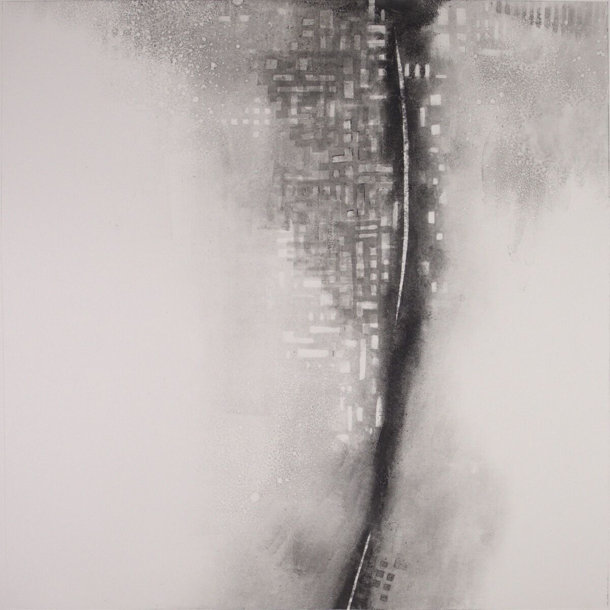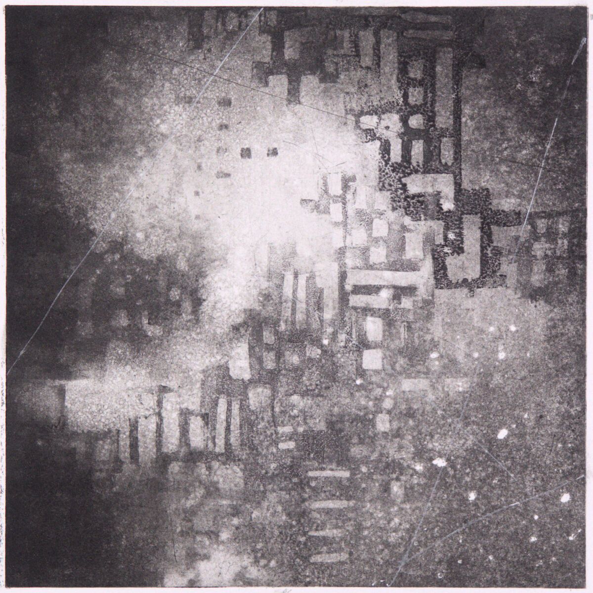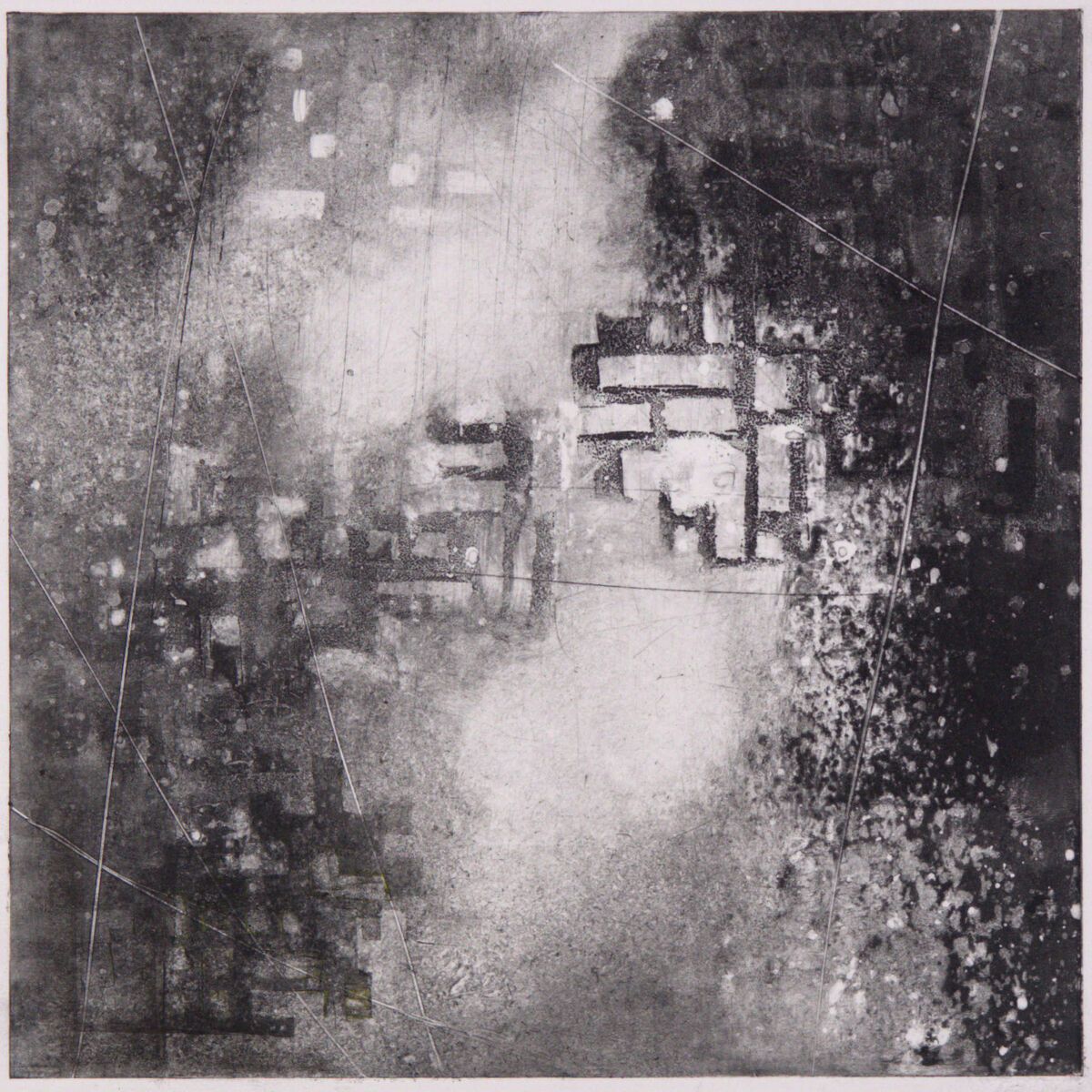 Convergency - Monotype, pochoir, 2022; Akua intaglio on Rives BFK; 18"x18"; mounted on cradled wood panel
